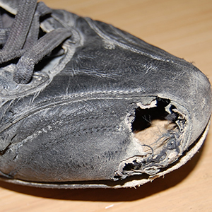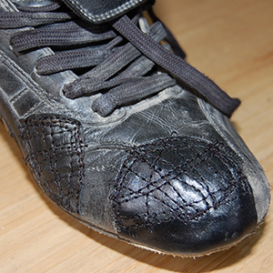 P革やコバ金では防ぎきれず破れてしまったスパイクを補修します。